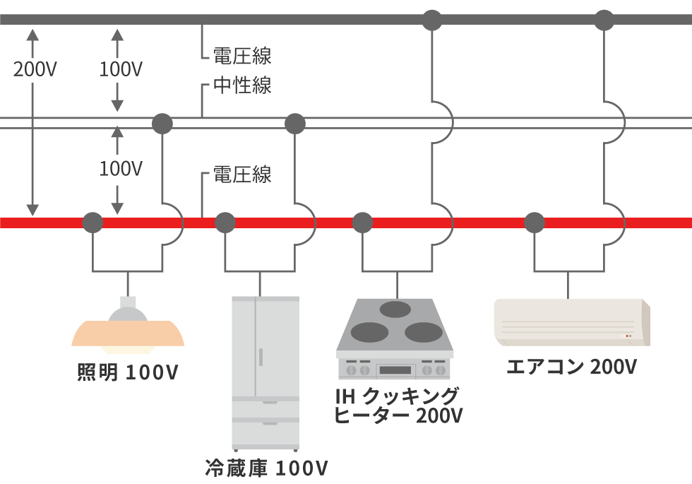 「単相3線式」は、3本の電線のうち真ん中の中性線と上または下の電圧線を利用すれば100ボルト、中性線以外の上と下の電圧線を利用すれば200ボルトが「単相2線式」は、電圧線と中性線の2本線を利用するため、100ボルトしか使用することができません。