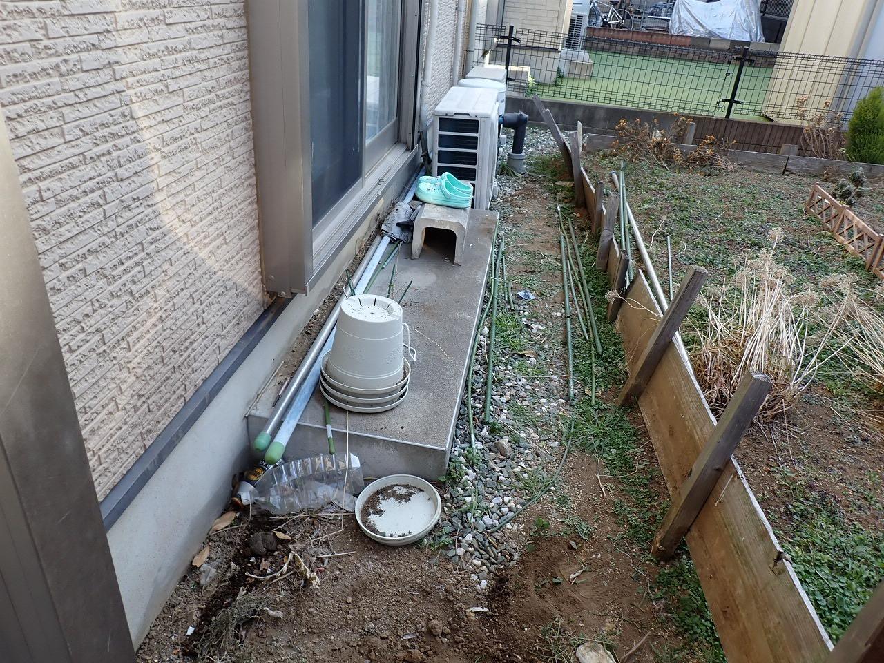千葉県流山市にエアコン室外機の移動工事で 伺いました。 今回庭にウッドデッキを作るので この室外機を移動したいそうです。 掃き出し窓の下を通して向こうの通路側に 室外…