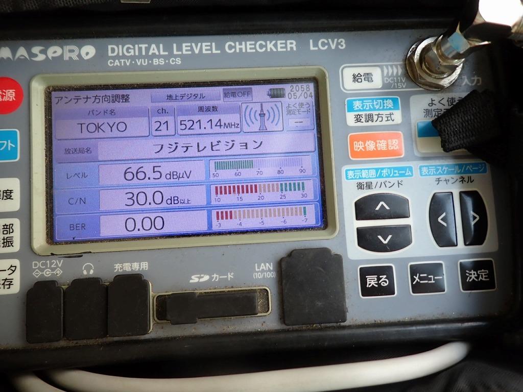 千葉県野田市に伺いました。 東京MXが頻繁に映らなくなるそうで 安定して視れるようにしたいとのことです。 テレビ端子の数値です。 レベルがかなり低いようです。 この数値だと見れなく…