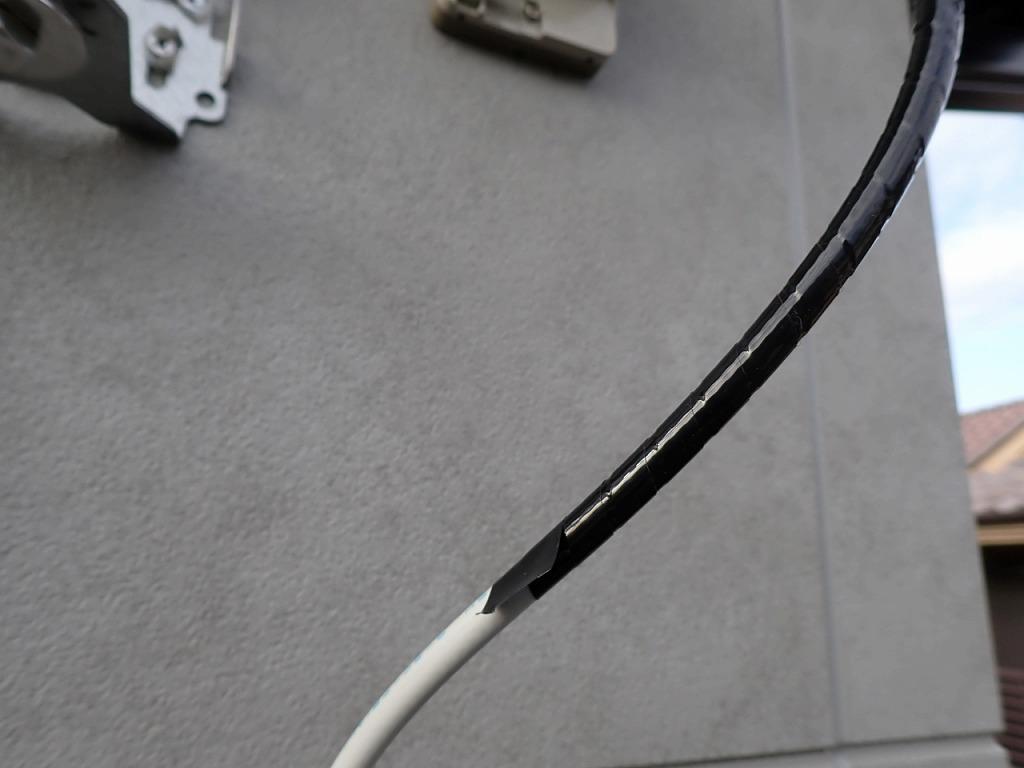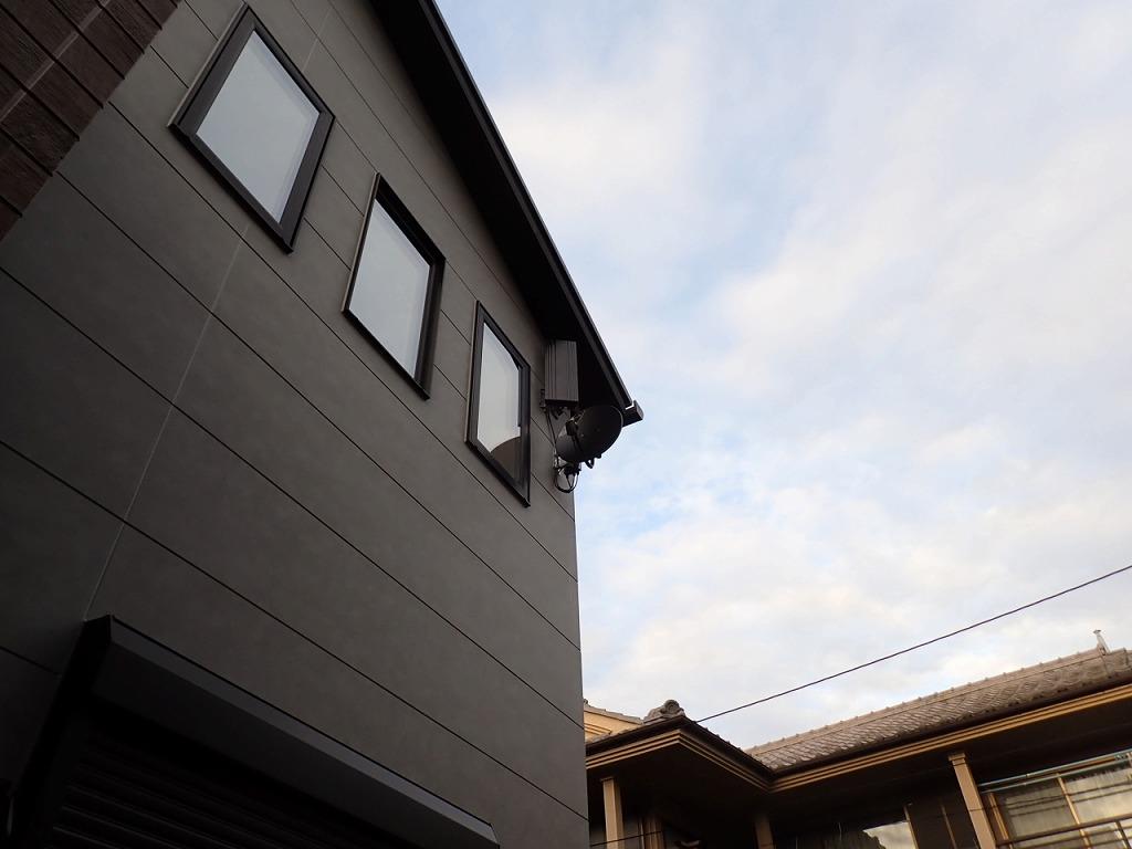 白いアンテナ線は劣化が早いし黒系の外壁に合っていません。