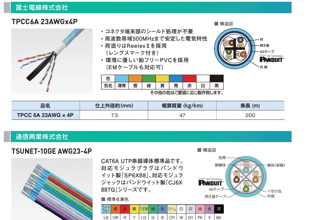 カテゴリー6A(cat6a)の工事では冨士電線製か通信興業製の